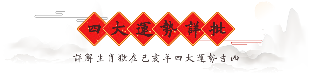 2019己亥年,生肖猴遭遇害太岁,因正值害太岁之年,财运并不理想。要想有收益,必然要付出更多的辛苦努力。感情婚姻方面没有半颗与桃花有关的吉星协助,多半与桃花运无缘。健康方面被太岁泄身,要特别注意肾脏方面的。幸好本年天干己土,为生肖猴的正印,有利于进行考试或考察,学习运不错,所以从事公务或文学工作的生肖猴朋友今年上升运程明显。