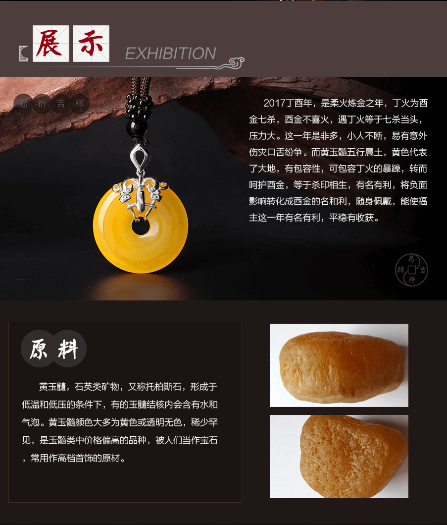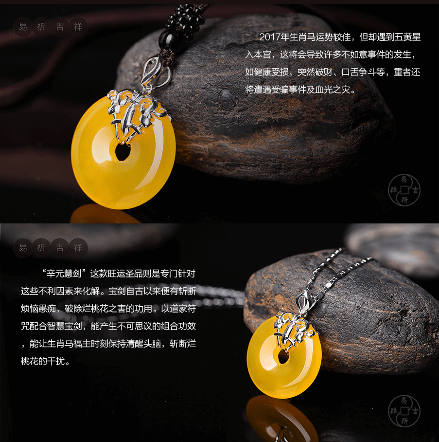易祈吉祥2017年十二生肖吉祥物挂件,设计独具匠心,每一处细节处理,都以“助旺福主”为重心。黄玉髓与银边浑然一体,互相映衬互为助力,福主长久佩戴,能催旺福主运势,全年如意吉祥。