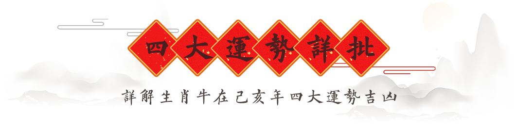 生肖牛度过了与太岁相刑的戊戌年,进入2019己亥年,属牛人全年运势显著回升,可谓瑞气盈门,吉庆满堂,宏图大展。财运事业桃花皆得意,为12生肖中好运生肖之一。己亥年,太岁为生肖牛的财星,在事业和工作上会得到强有力的发展机会,大有求名得名、求利得利的意象。今年会有贵人提拔,地位显著提升进 步的机会,只要好好把握,一定会对自己的事业工作产生很大的助力。从商者今年也容易在本行业做出声名,从而收获不错的回报。今年也是属牛人桃花旺盛的一年,单身人士有望觅得一段稳定的美好姻缘,关系成熟者也有缔结婚姻的机会。