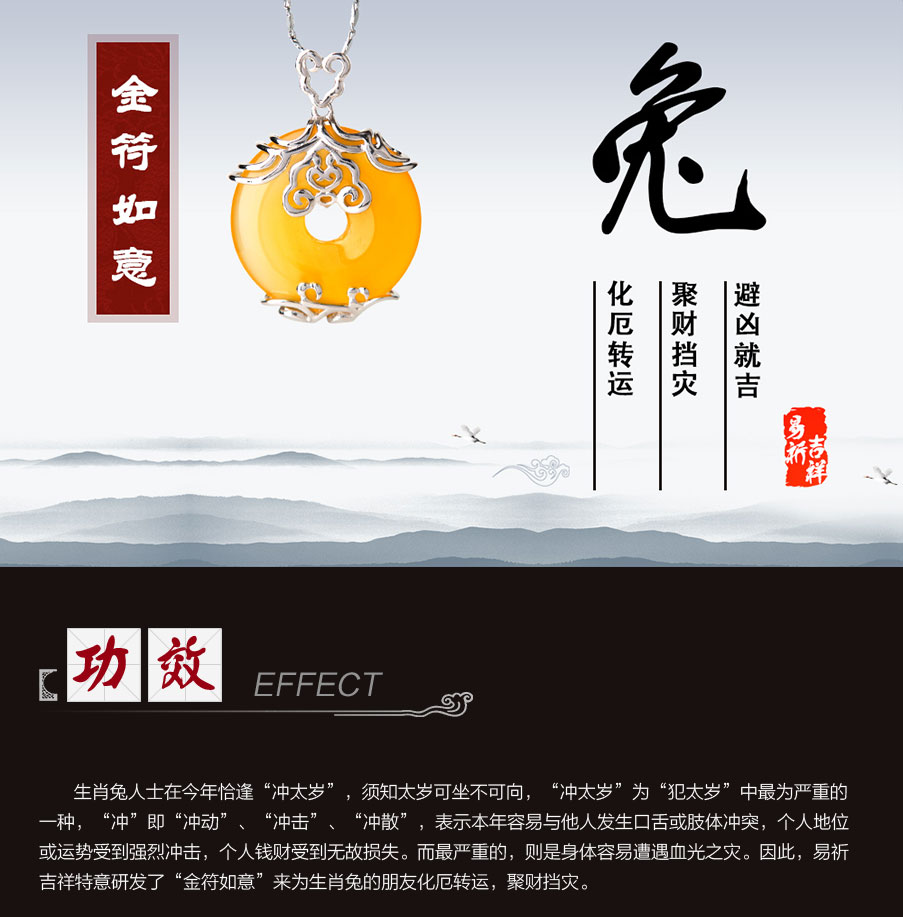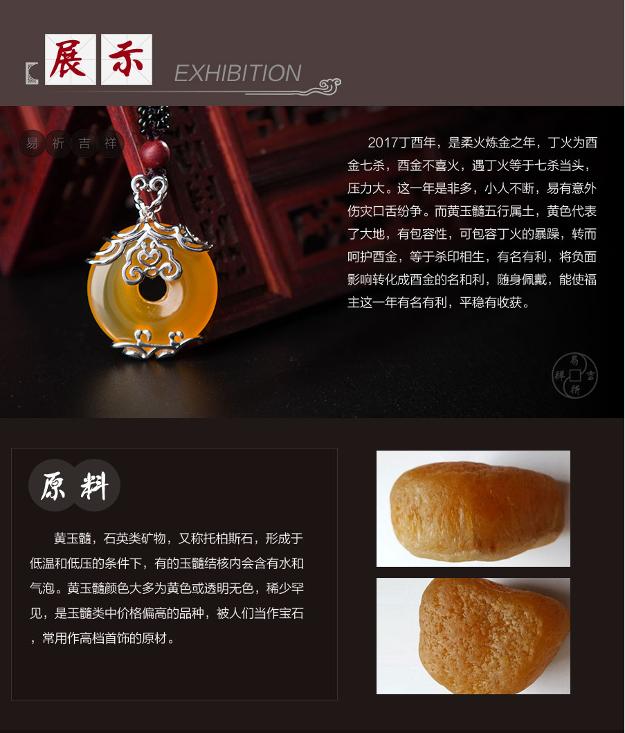 易祈吉祥2017年十二生肖吉祥物挂件,设计独具匠心,每一处细节处理,都以“助旺福主”为重心。黄玉髓与银边浑然一体,互相映衬互为助力,福主长久佩戴,能催旺福主运势,全年如意吉祥。